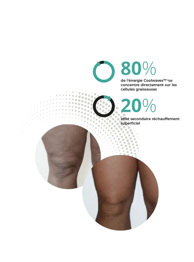 Le traitement Onda est une solution efficace pour l’accumulation locale de graisse, la peau d’orange, le relâchement cutané et la correction générale de la silhouette. Le révolutionnaire Coolwaves™ envoie des ondes ciblées aux cellules graisseuses du corps. Les Coolwaves™ ont une fréquence différente de celle des ondes utilisées traditionnellement. Cette fréquence est très bien absorbée par les cellules graisseuses, plutôt que par les molécules d’eau. Les deux couches extérieures de la peau, qui ne contiennent que beaucoup de molécules d’eau, absorbent beaucoup moins ces ondes. Ainsi, 80% de l’énergie du Coolwaves™ va directement aux cellules graisseuses ! Bref, le Coolwaves™ “évitera” largement la peau vulnérable et utilisera son énergie de la manière la plus optimale possible en cas de besoin.